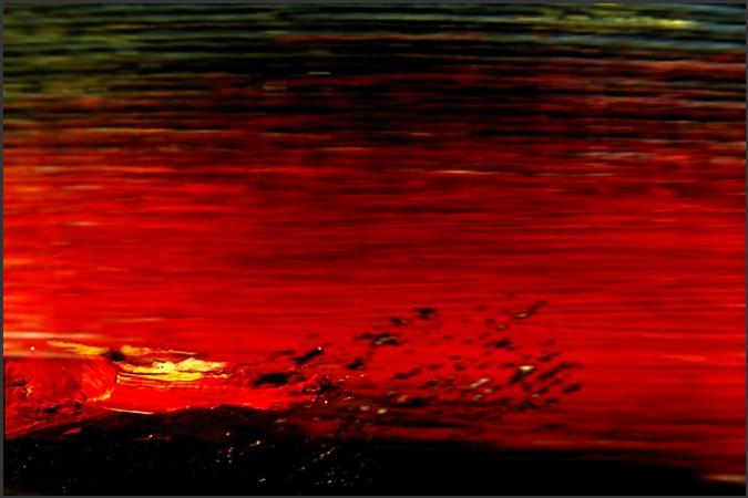 Phase 4: Scheinbare Ruhe. Die Sphäre blutrot. Einsamer Goldstreif, schwebend. Widerstrebendes Dunkel. Implosion.